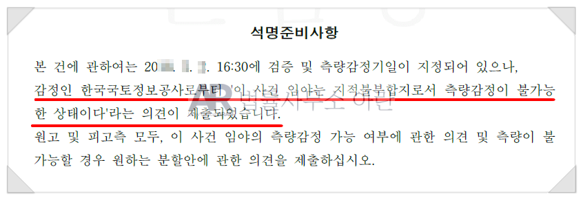 측량감정기일을 1주일 앞둔 날, 국토정보공사에서는 이 사건 토지가 지적불부합지이므로 측량감정이 불가능하다는 의견을 제출하였습니다.