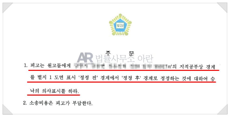 이에 최아란 변호사는 B를 상대로 측량성과도의 경계선에 대해서 동의하라는 내용의 소송, 즉 등록사항정정 승낙의사표시 청구의 소를 제기하였습니다.
