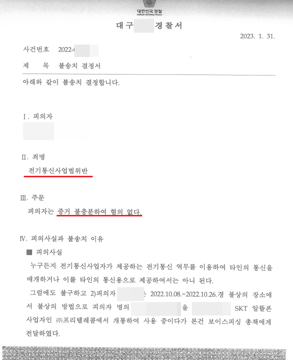 의뢰인은 생활고에 시달리다가 급한 돈을 마련하고자 본인 명의로 여러 대의 휴대전화를 개통하여 기기는 팔고, 유심칩은 보관하는 형태로 무리한 개통을 계속하였습니다. 그러다가 보유하던 유심 중 일부가 보이스피싱에 활용되었고, 경찰수사를 받게 되었습니다.