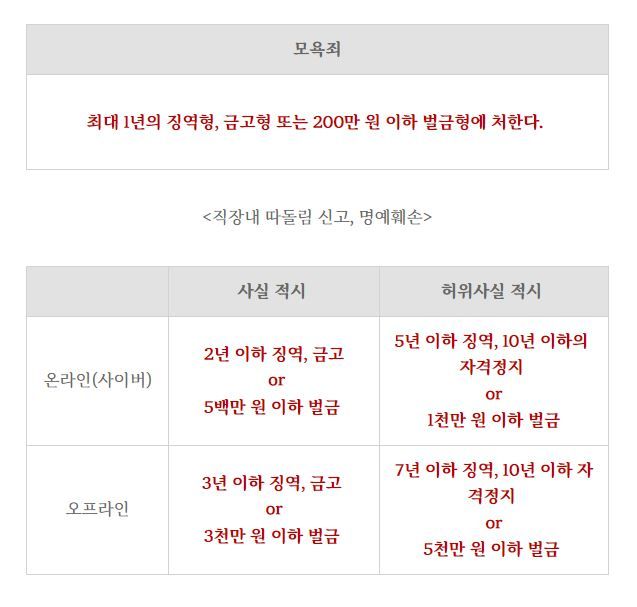 실제로 명예훼손, 모욕죄 처벌 수위는 아래와 같습니다.