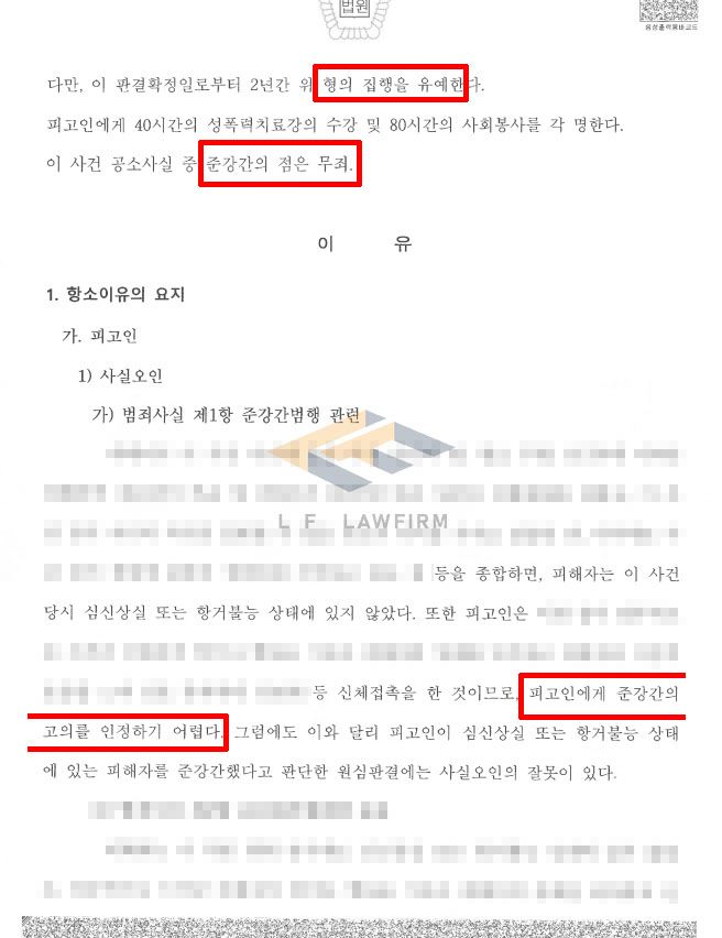 변호인으로서 의뢰인과 사건에 대해 다시 한 번 많은 이야기를 나누었고, 증거기록 및 1심 재판의 기록들을 모두 꼼꼼히 원점에서 재검토 하게 되었으며, 이를 기초로 항소이유서 및 변호인의견서를 수회 작성하여 제출하였고, 추가적으로 법정에서 전문심리위원을 참여시켜 당시의 상황을 재구성하는 변호를 하였으며, 모든 사정을 종합하여 의뢰인에게 준강간의 고의가 없었음 등을 적극 변론하게 되었습니다.
