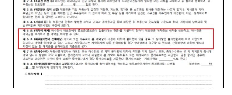 위 부동산 매매계약서상 5조에서는 민법상의 일반원칙을 다시 한 번 확인하면서 6조에서 계약금을 손해배상의 예정으로 보는 특약조항을 넣어두었기 때문에 당사자간에 금전적인 분쟁이 발생하여 일방당사자가 손해를 입었다면 해당되는 손해배상의 기준은 계약금이 되는 것입니다
