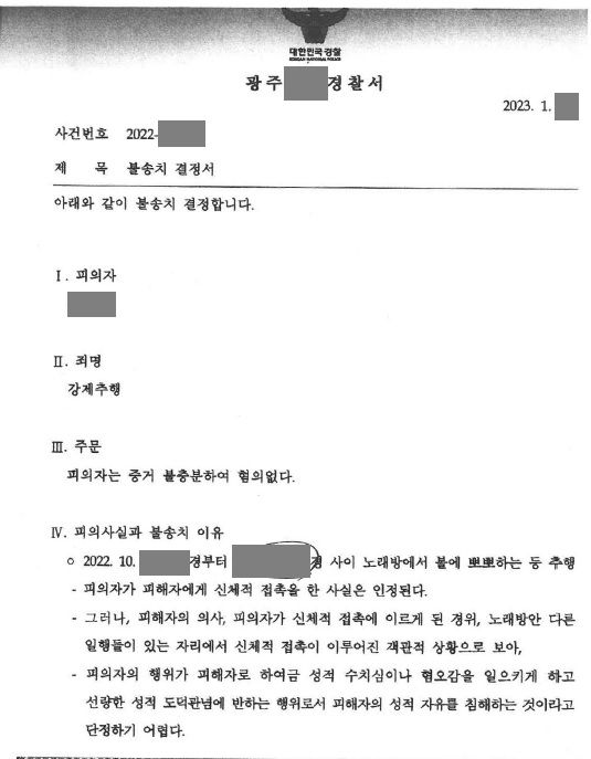 경찰은 신체적 접촉 사실은 인정된다면서도 피해자의 의사, 피의자가 신체적 접촉에 이르게 된 경위, 다른 일행들도 함께 있는 노래방에서 신체적 접촉이 이루어진 객관적 상황으로 보아 피의자의 행위가 피해자로 하여금 성적 수치심이나 혐오감을 일으키게 하고 선량한 성적 도덕관념에 반하는 행위로서 피해자의 성적 자유를 침해하는 것이라고 단정하기 어렵다면서 불송치결정(무혐의처분)을 내렸습니다. 덕분에 의뢰인은 억울하게 성범죄 전과자가 될 위기에서 벗어나 일상생활로 복귀할 수 있었습니다.