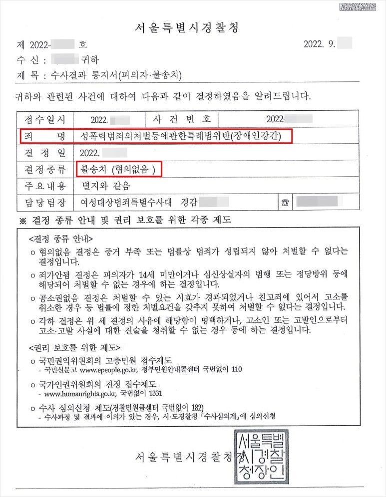 "장애인 강간 성공사례 - 불송치(혐의없음)"