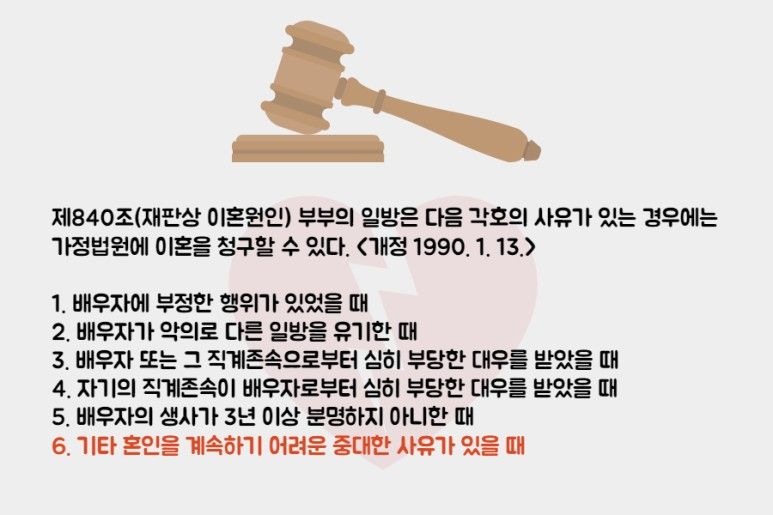 민법 제840조 재판상 이혼원인 6호에서는 "기타 혼인을 계속하기 어려운 중대한 사유가 있을 때" 가정법원에 이혼을 청구할 수 있다고 규정하고 있습니다.