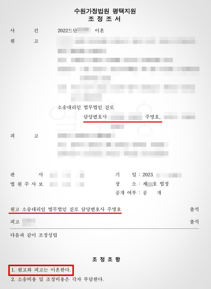 이번 이혼조정의 경우 13년이라는 장기간 별거로 인하여 이혼에 대한 부분만 합의가 이루어지면 되는 사건이었고, 조정기일에 출석한 상대방과 원만하게 합의가 이루어져 혼인이 해소되었습니다.
