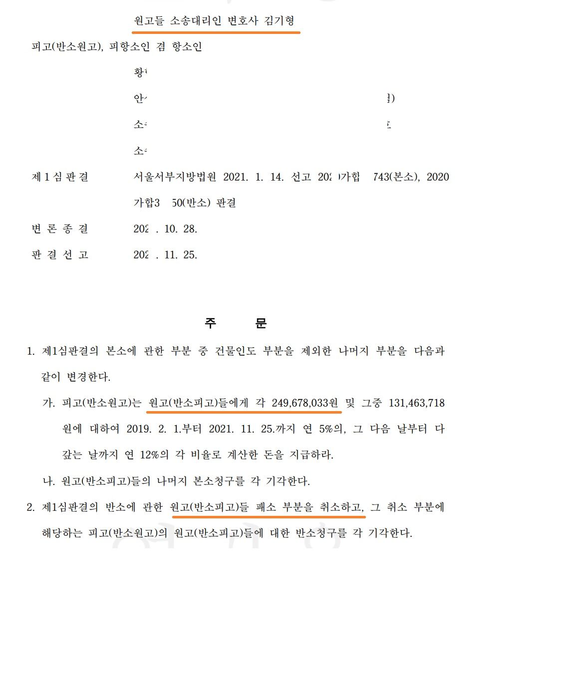 피고가 원고들에게 각 2억5천만원을 지급하라는 판결로 총 6억 5천여 만원의 차이가 나는 결과를 얻어낸 사례.