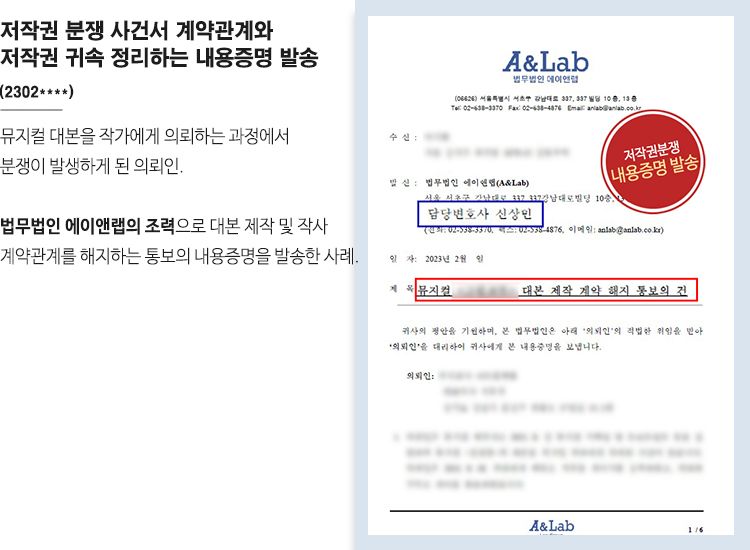 우리 의뢰인은 뮤지컬 제작자로 한 뮤지컬의 대본을 작가에게 의뢰하였습니다. 이후 계약서를 송부하였고 구두로 계약을 완료하였으나 추후 분쟁이 발생하게 되며 저희 법무법인 에이앤랩에게 도움을 요청하였습니다.