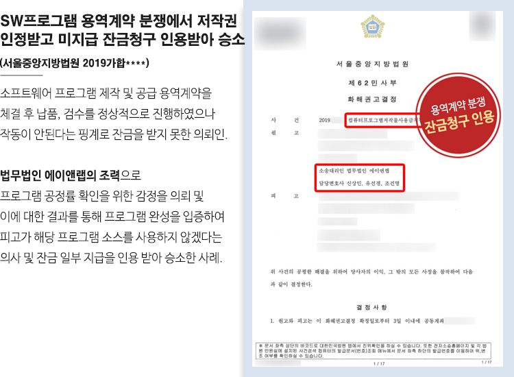 이에 피고 측에서는 의뢰인이 제공한 프로그램 소스를 사용하지 않겠다는 의사를 표명해왔고 또한 지급받지 못했던 잔금 일부도 모두 받으며 원만하게 사건을 종결할 수 있었습니다.