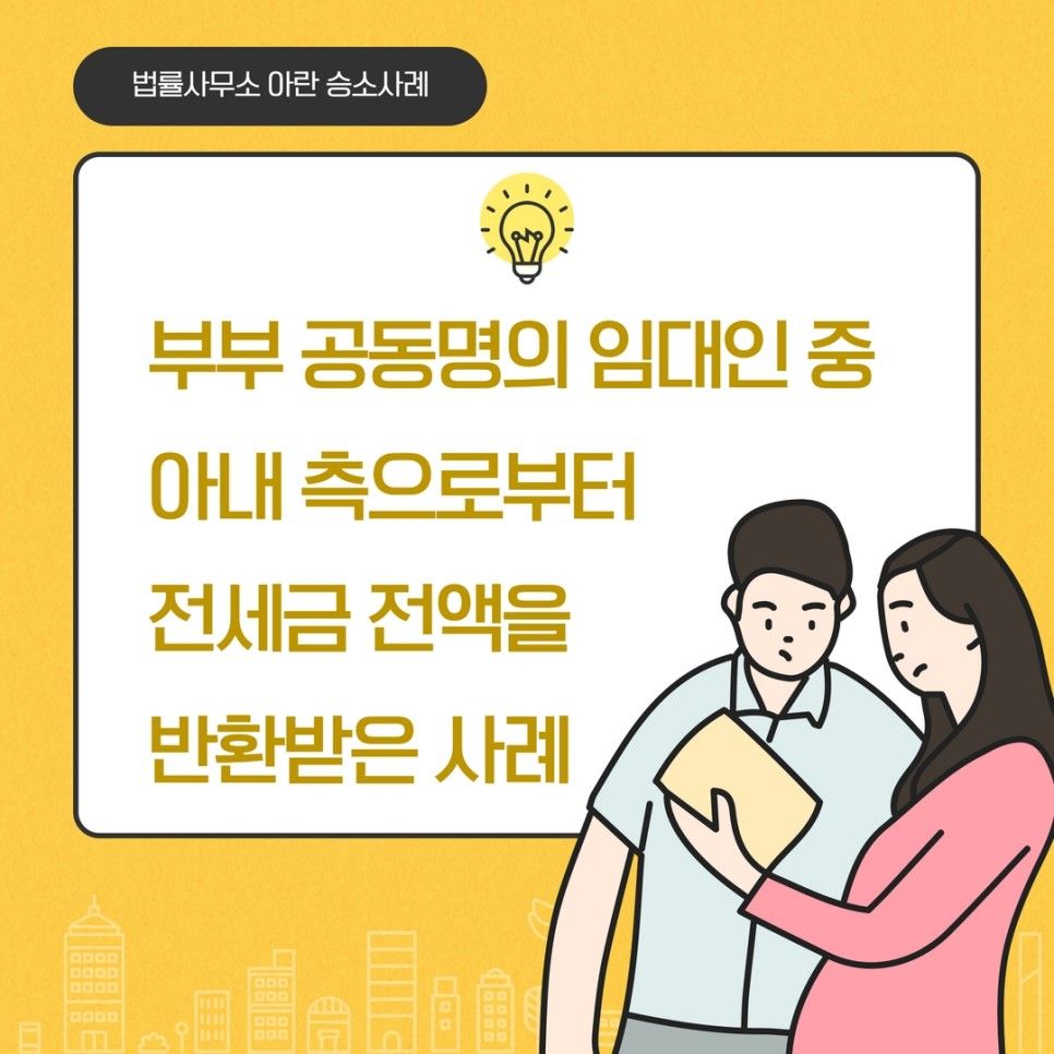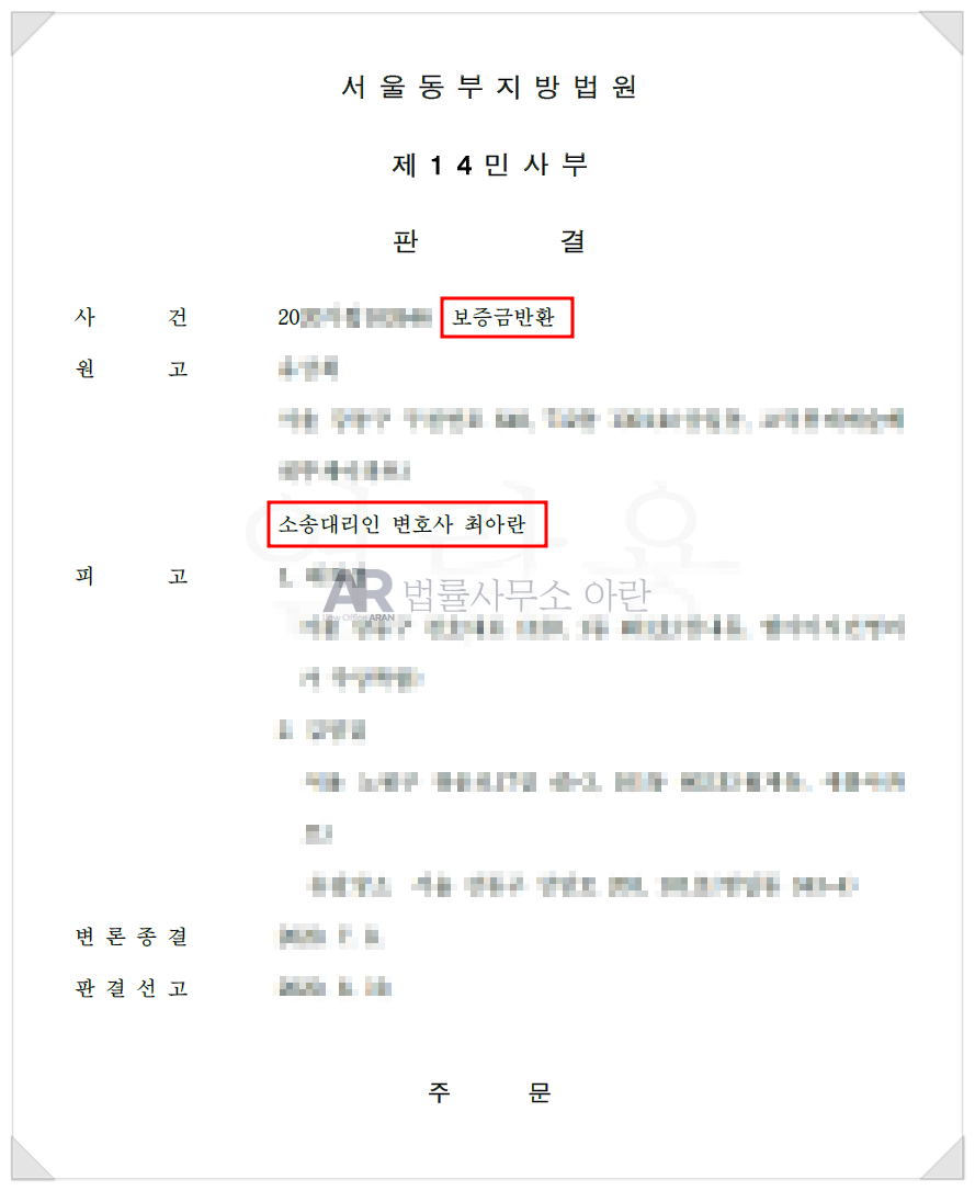 이에 의뢰인은 집주인 부부의 형편이 더욱 악화되기 전에 하루라도 빨리 전세 보증금을 돌려받기 위해 최아란 변호사에게 사건을 맡겨 주셨습니다.