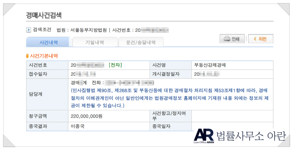 그러던 중, 의뢰인이 살고 있던 오피스텔의 몇몇 세대에 대하여 경매가 진행중이라는 사실을 알게 되었습니다. 발빠르게 대응해야겠다고 생각한 의뢰인은 즉시 집주인에게 "만기때 이사를 나가겠으니 보증금을 반환하라"라고 촉구했습니다.