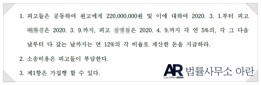 물론 전세 보증금 반환 청구 소송에서도 남편은 물론 와이프에게도 전액을 받아내라는 판결을 받아냈습니다(판결 주문의 '피고들은 공동하여 원고에게 돈을 지급하라'라는 것은, 피고들이 해당 금액을 1/n으로 지급하라는 의미가 아닙니다. 원고에게 돈을 다 지급할 때까지 피고 각각이 전액에 대하여 책임을 진다는 의미입니다).