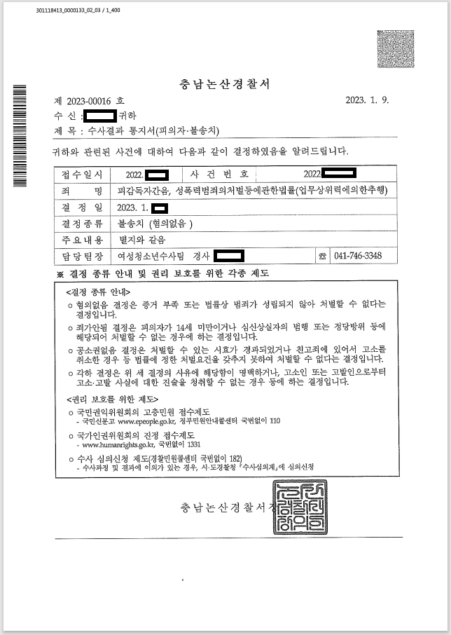 그런데 여직원이 퇴사를 앞두고 갑자기 돌변하여 그간의 관계가 너무 싫었고 무서웠다는 이야기를 하기 시작했습니다. 의뢰인으로서는 갑자기 돌변한 여직원의 태도에 너무도 놀랐으나 침착하게 상대의 강간고소를 방어할 수 있는 증거를 정리하셨습니다. 다행히도 두 사람간의 대화 녹음파일, 카카오톡 대화내용 등의 여러 증거들이 있었고 두 사람간의 성관계가 업무상 위력에 의해 이루어졌다고 단정하기는 어려워 불송치결정을 받을 수 있었습니다.