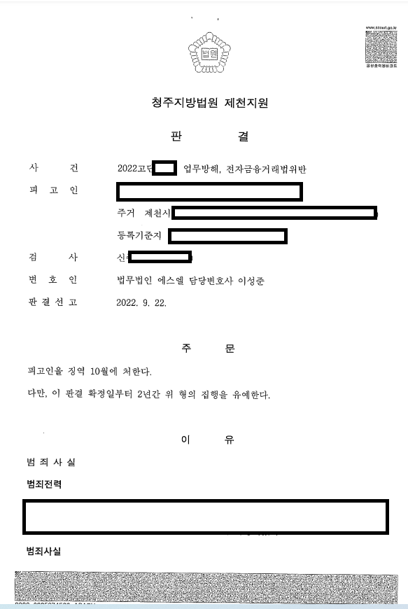 의뢰인께서는 생활고에 시달리던 중 용돈을 벌수 있다는 말을 듣고 법인을 설립하고 법인통장을 계설해 주었는데 이 통장이 보이스피싱 사기 범죄에 이용되었습니다. 의뢰인의 용돈을 벌려했던 행동이 결국 보이스피싱범죄에 이용되었던 것입니다. 이로인해 금융기관에 대한 업무방해, 전자금융거래법위반으로 기소되어 재판을 받게 되었고 의뢰인은 동종 전과가 이미 있었던 상황이어서 실형가능성이 매우 높은 상황이었습니다. 그리고 전과외에 앞전 집행유예선고를 받은 사실이 있어 소위 쌍집행유예가 가능할지 고민되는 상황이기도 하였습니다. 그러나 저의 도움을 받아 다행히 집행유예 선고를 받을 수 있었으며 일상으로 회복할 수 있었습니다. 단순히 명의를 빌려주는 것도 중한 처벌을 받을 수 있다는 점을 명심하시고 본인 명의의 계좌나 핸드폰 등으로 인해 문제가 발생하여 수사기관의 연락을 받으셨다면 연락주시기 바랍니다. 성심껏 도움을 드리겠습니다