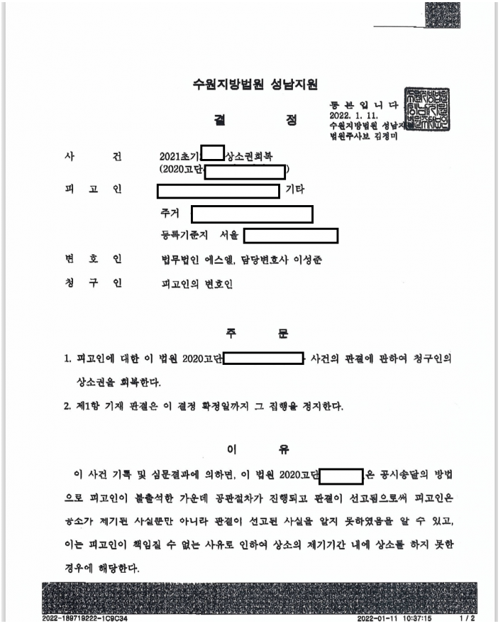 의뢰인께서는 공소장은 송달을 받았으나 이후의 공판 절차의 서류들은 송달 받지 못하여 공시 송달로 재판과 선고가 진행되어 징역형이 선고된 사안입니다. 자신의 책임질 수 없는 사유가 소명되어야 하지만 의뢰인께서 수사를 받고 공소장까지 송달 받은 경우라 청구가 인용될지 장담할 수 없는 상황이었습니다. 그러나 저희는 송달불능보고서가 회신온지 6개월이 되지 않은 기간안에 공시송달결정된 점을 주장하여 다행히 상소권회복과 형집행정지를 받을 수 있었습니다. 또한 의뢰인은 항소심에서 집행유예를 받아 가족들의 품으로 돌아갈 수 있었습니다.