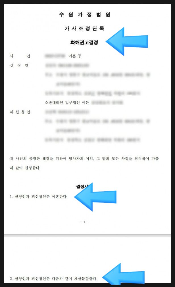 이후 저는 두 사람의 재산분할에 대한 협의서를 작성해서 법원에 협의된 내용으로 조정을 신청했습니다. 결과적으로 화해권고 결정이 빠르게 내려져서 A 씨는 법원 출석 없이 한 달 반만에 남편 B 씨와의 관계를 정리할 수 있었죠.
