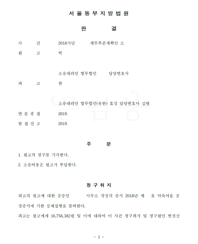 저는 의뢰를 받고 즉각 응소하여 의뢰인이 홍보대행 업무를 모두 수행하여 용역비 채권이 존재하며 따라서 공정증서가 유효하고 원고의 모든 청구가 이유 없음을 주장 입증하였습니다. 결국 법원은 저희의 주장을 받아들여 원고 패소 판결을 선고하였습니다.