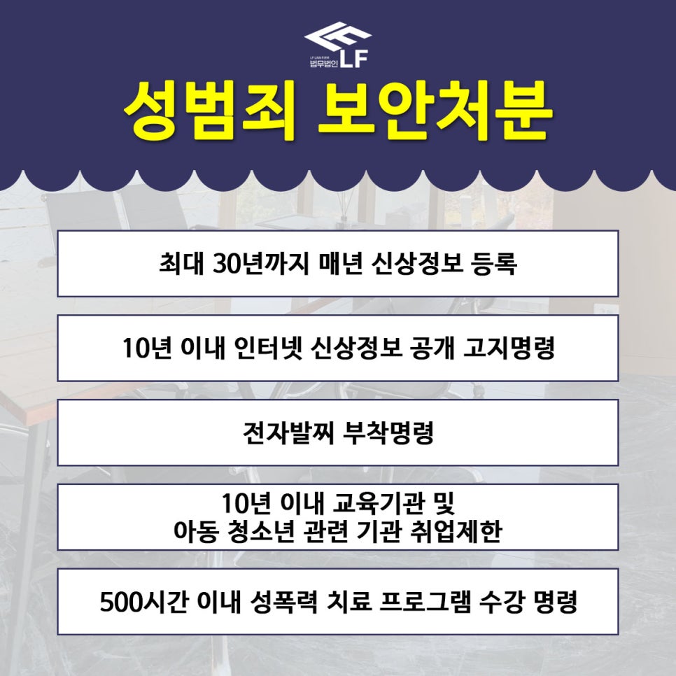 범행 사실이 인정되어 형법과 아청법에서 규정하고 있는 이 혐의에 대한 벌금이나 징역 처벌에 처하게 되면 신상정보등록, 공개 및 고지, 교육기관 또는 아동 및 청소년 관련기관 취업 제한, 현재 근무하고 있는 직장에서의 해임 조치, 일부 국가 비자발급 제한, 전자발찌 착용, DNA 채취 및 보관, 성폭력 치료 프로그램 수강 등의 성범죄 보안처분을 동시에 받게 됩니다.