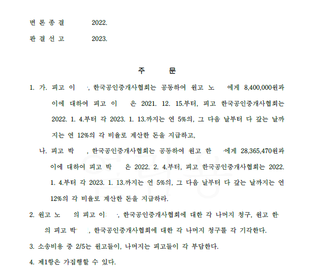저는 즉각 공인중개사 및 공인중개사협회를 피고로 하여 민사소송 손해배상청구를 하였고 법원은 저희의 주장을 받아들여 승소 판결을 선고하여 의뢰인들은 피해액을 배상받게 되었습니다.