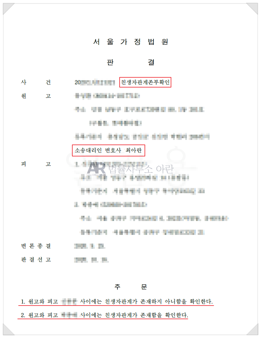 법원은 위 검사 결과에 따라 원고(의뢰인)와 호적상 어머니에게는 친생자관계가 존재하지 아니함을 확인하고, 원고와 생모 사이에는 친생자관계가 존재함을 확인한다는 판결을 선고하였습니다.