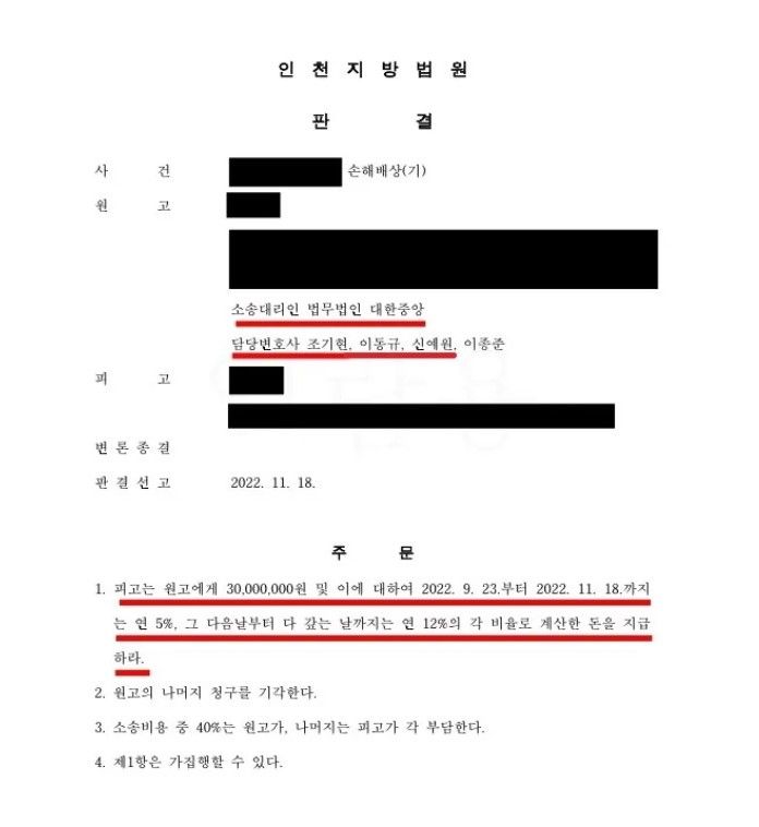 재판부는 조기현변호사의 주장을 받아들여 피고에게 의뢰인을 상대로 3,000만원의 손해를 배상할 것을 결정하였습니다. 이후 기일에 따라 배상이 모두 이루어지지 않으면 12% 이자도 지급할 것을 동시에 명하였습니다.
