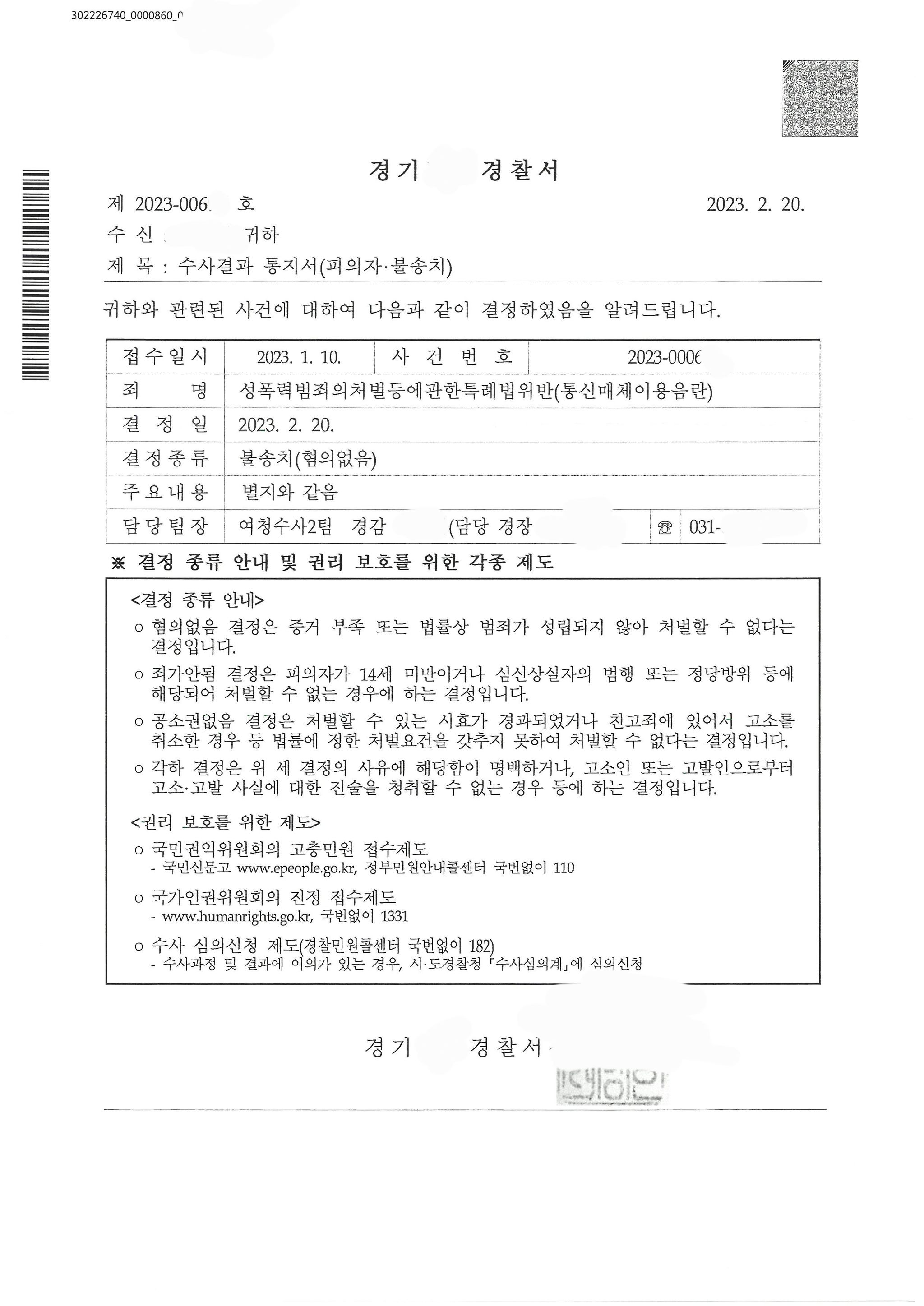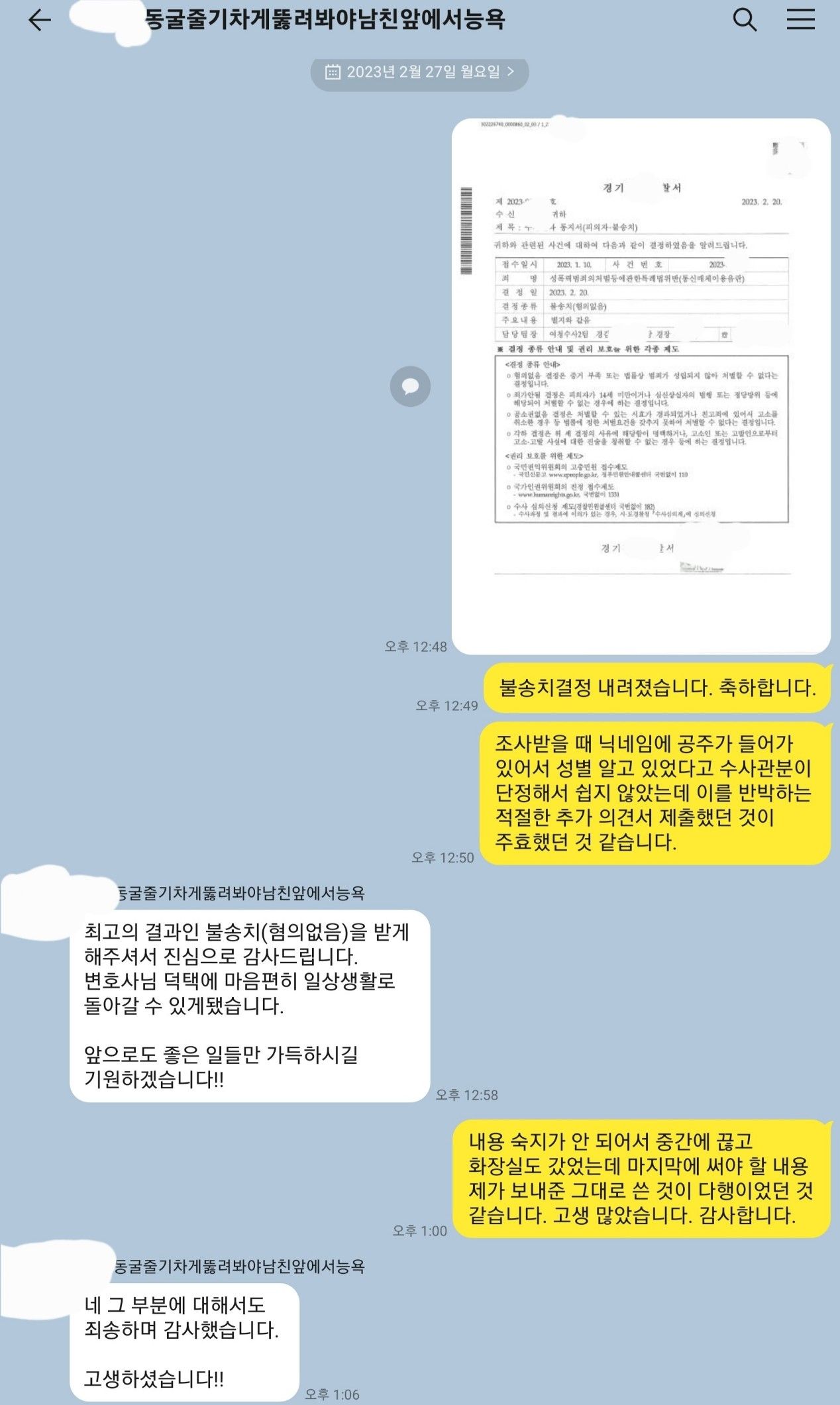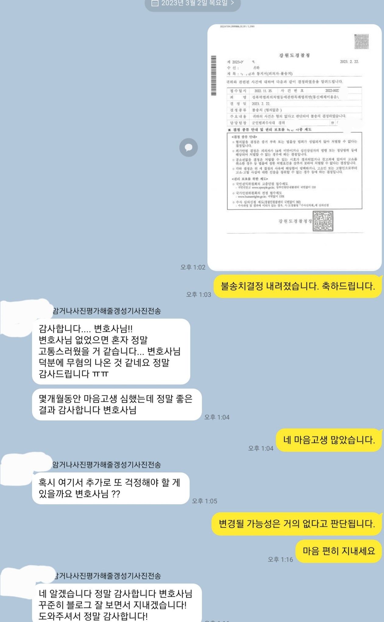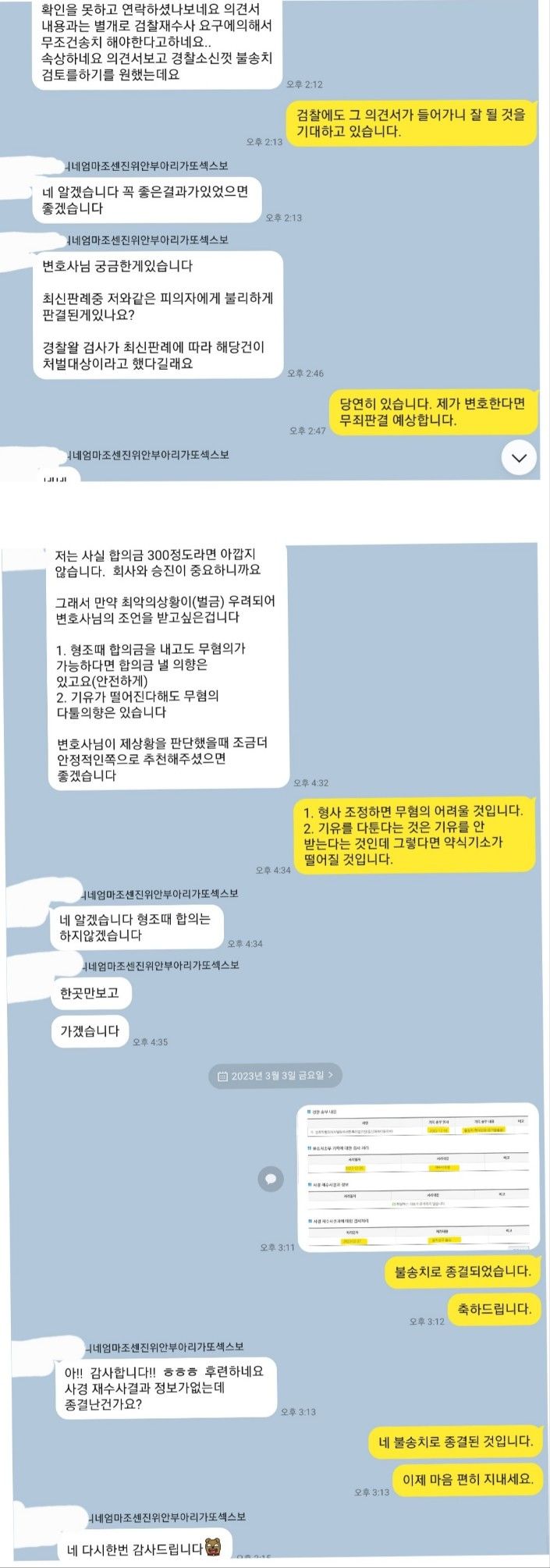 위 사안에서는 경찰 수사관분이 송치할 수밖에 없다고 이미 말했던 것과 달리 불송치로 무사히 마무리되었습니다. 대화내용을 보면 알겠지만 특히 공기업에 종사하는 사람들이 저를 선임한 이후 최초 협의와 달리 의견을 바꿔 합의하고 싶다, 형사조정하고 싶다는 등 사람을 짜증나게 하는 경우가 종종 있는데 이 의뢰인은 다행히 저를 믿고 따라주었습니다. 공무원, 교사에 비교하여 공기업 직원이 동일한 입장인 것 같아도 유독 공기업 직원들이 그렇게 행동하는 것은 아마 기소유예를 받으면 공무원, 교사와는 달리 별도의 징계가 없기 때문이 아닌가 추측됩니다.