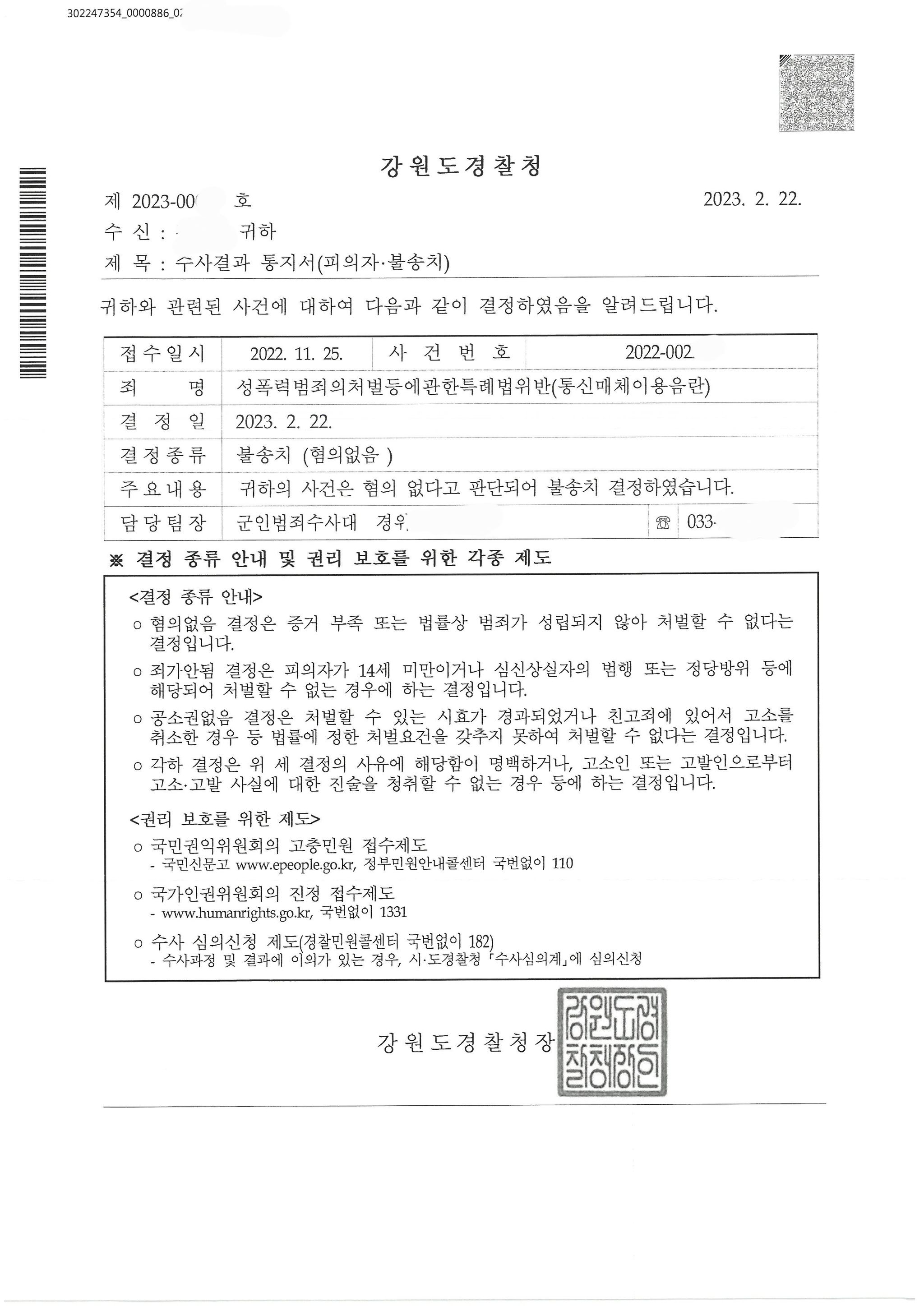 이 사안은 성기사진을 전송한 사안입니다. 작년 7월부터 발생한 군인 성범죄에 대하여 민간 수사기관에서 조사를 하게 되었습니다. 이에 발맞춰 군인들이 많은 강원도 지역은 강원도경찰청에 별도의 군인범죄수사대를 설치하였습니다. 군인범죄수사대는 춘천에 있는 별도의 2층 단독주택을 개조한 것으로 보이는 건물에 따로 떨어져 있는데 강원도경찰청보다 접근성은 더 나은 것 같습니다. 다만 주차는 좀 불편한데 저는 여러 번 조사입회로 가면서 기사차량을 이용하였기 때문에 별다른 불편은 없었습니다. 제가 조사입회로 자주 갔기 때문에 군인사건만 전문적으로 맡고 있는지 수사관분이 물어보기도 했지만 알다시피 군인사건을 많이 하기는 하지만 제가 군인 신분으로 범한 범죄를 전문으로 하는 것이 아니라 성범죄를 포함해서 성착취물 사건들을 전문적으로 변호하고 있습니다.