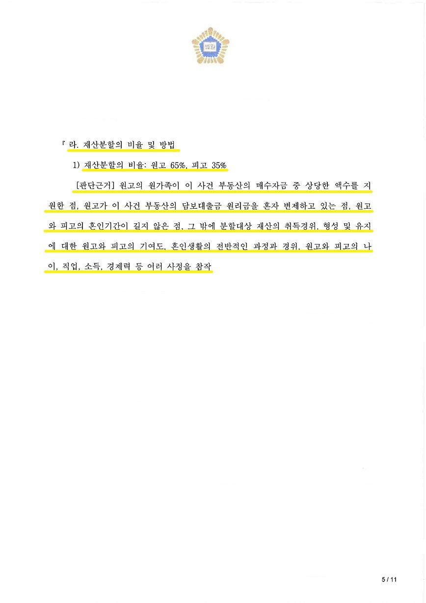 다행히 항소심에서 재산분할의 비율이 변경되어 의뢰인의 기여도를 65%까지 높이면서 성공적으로 마무리된 사안입니다.