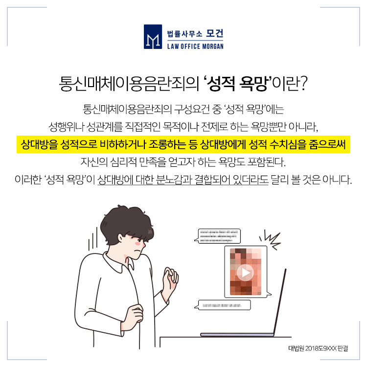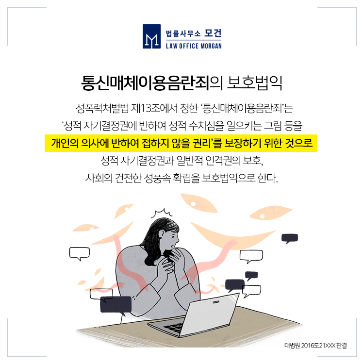 이처럼 통신매체이용음란죄는 ‘성적 자기결정권에 반하여 성적 수치심을 일으키는 그림 등을 개인의 의사에 반하여 접하지 않을 권리’를 보장하기 위한 것으로 ‘성적 수치심이나 혐오감을 일으키는 것’은 피해자에게 단순한 부끄러움이나 불쾌감을 넘어 인격적 존재로서의 수치심이나 모욕감을 느끼게 하거나 싫어하고 미워하는 감정을 느끼게 하는 것으로서 사회 평균인의 성적 도의관념에 반하는 것을 의미합니다.