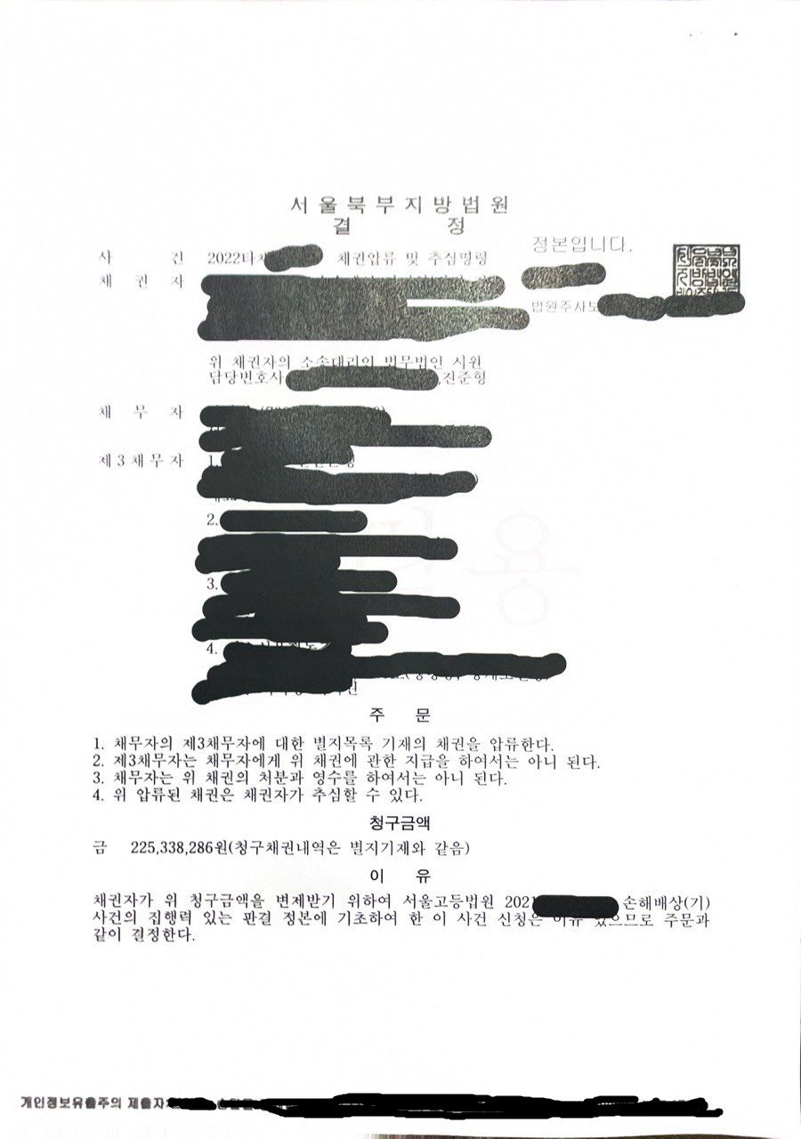 강제집행을 시작한 후 약 6주만에 채권 전부를 회수할 수 있었습니다.