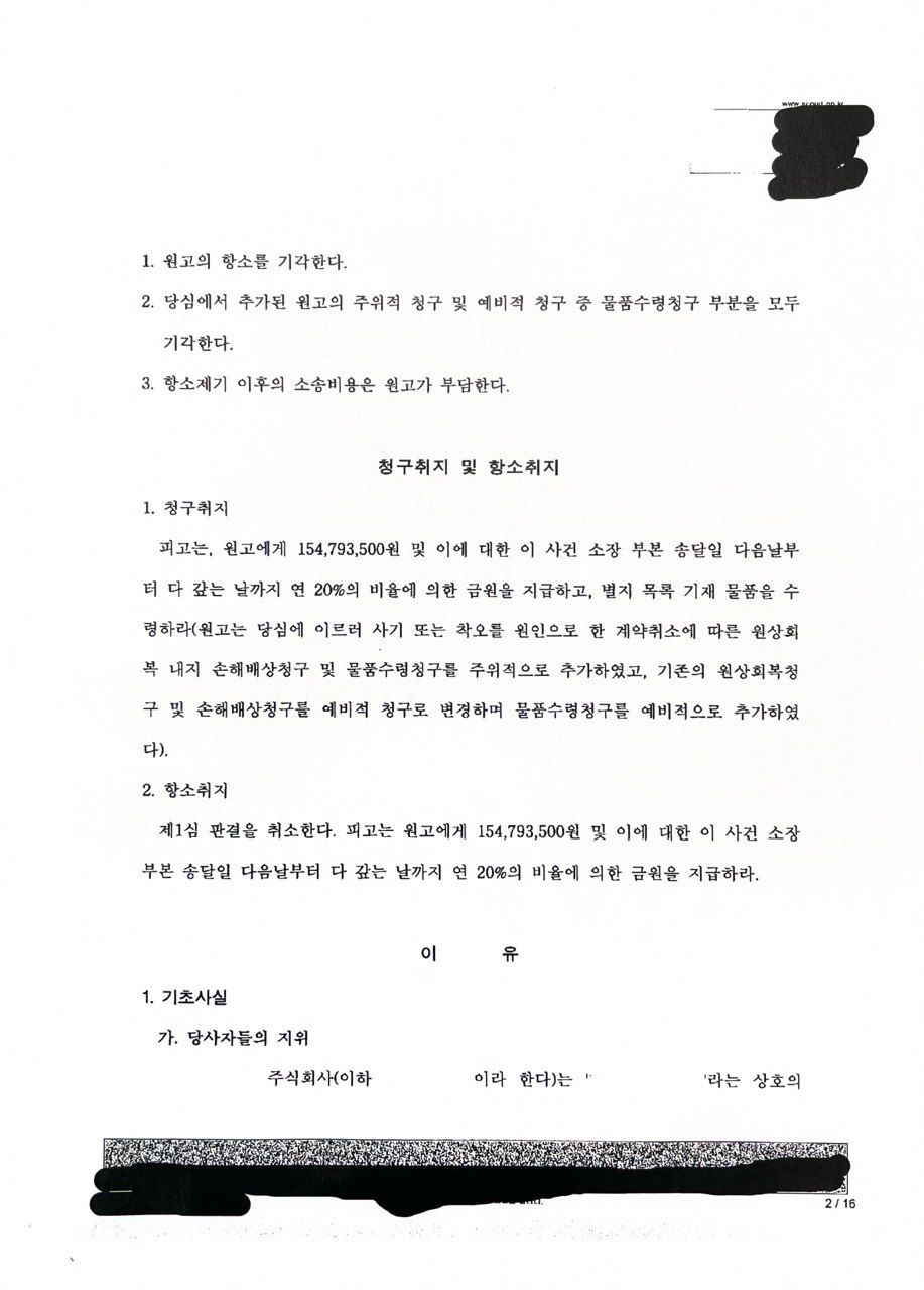 그런데 원고는 피고를 상대로 여러가지 사실관계에 기초하여 사기 또는 착오를 원인으로 한 계약취소 및 이에 따른 원상회복, 손해배상, 물품수령을 주위적으로 청구하고, 예비적으로 계약의 해제 및 이에 따른 원상회복, 손해배상, 물품수령을 청구한 사건입니다.