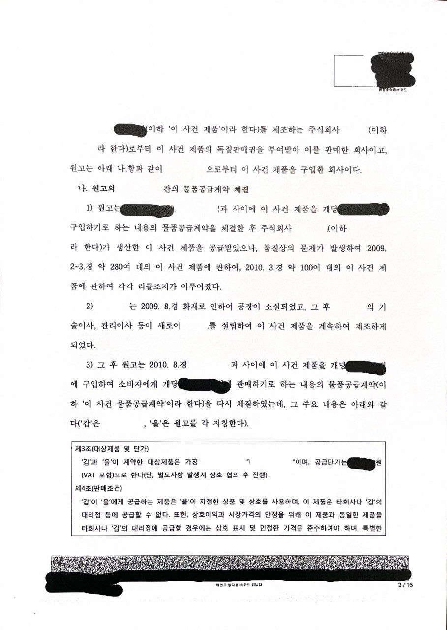 피고는 A라는 회사가 제조한 제품의 독점판매권을 가진 회사이고, 원고는 피고와 해당제품에 대한 물품공급계약을 체결하고 원고로부터 해당 제품을 공급받아 소비자에게 판매하는 회사입니다.