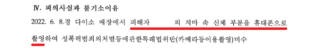A씨는 2022. 6. 8.경 다이소 매장에서 여성 B씨를 발견하고 접근하여 손에 휴대폰을 쥔 채로 B씨 옆에 쭈그려앉아있다가 휴대폰을 쥔 손이 B씨의 종아리에 닿았습니다. B씨는 안 그래도 A씨가 의심스러워 눈여겨보고 있었는데 휴대손을 쥔 손이 좋아리에 닿자 A씨를 째려보았고, A씨는 화들짝 놀라 황급히 자리를 떠났습니다.