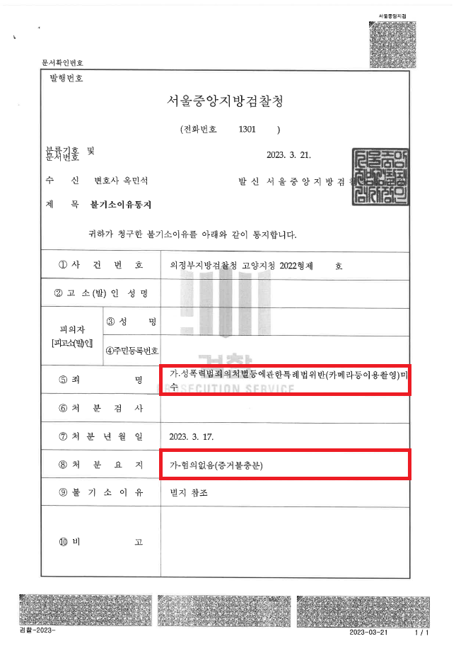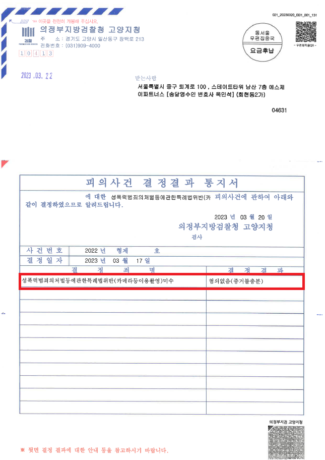 ⑥ 이후 "A씨가 B씨를 발견하고 접근하여 손에 휴대폰을 쥔 채로 B씨 옆에 쭈그려앉아있다가 휴대폰을 쥔 손이 B씨의 종아리에 닿은 사실은 모두 맞다. 그러나 A씨는 휴대폰 전원도 작동시키지 않았고, 당연한 결과로 카메라 어플도 실행시키지 않았으며, 디지털포렌식 결과 A씨가 직접 촬영한 사진이나 동영상도 전혀 발견되지 않았으므로, 촬영에 대한 실행의 착수가 인정되지 않는다."라는 내용의 변호인의견서를 작성하여 제출하였습니다.