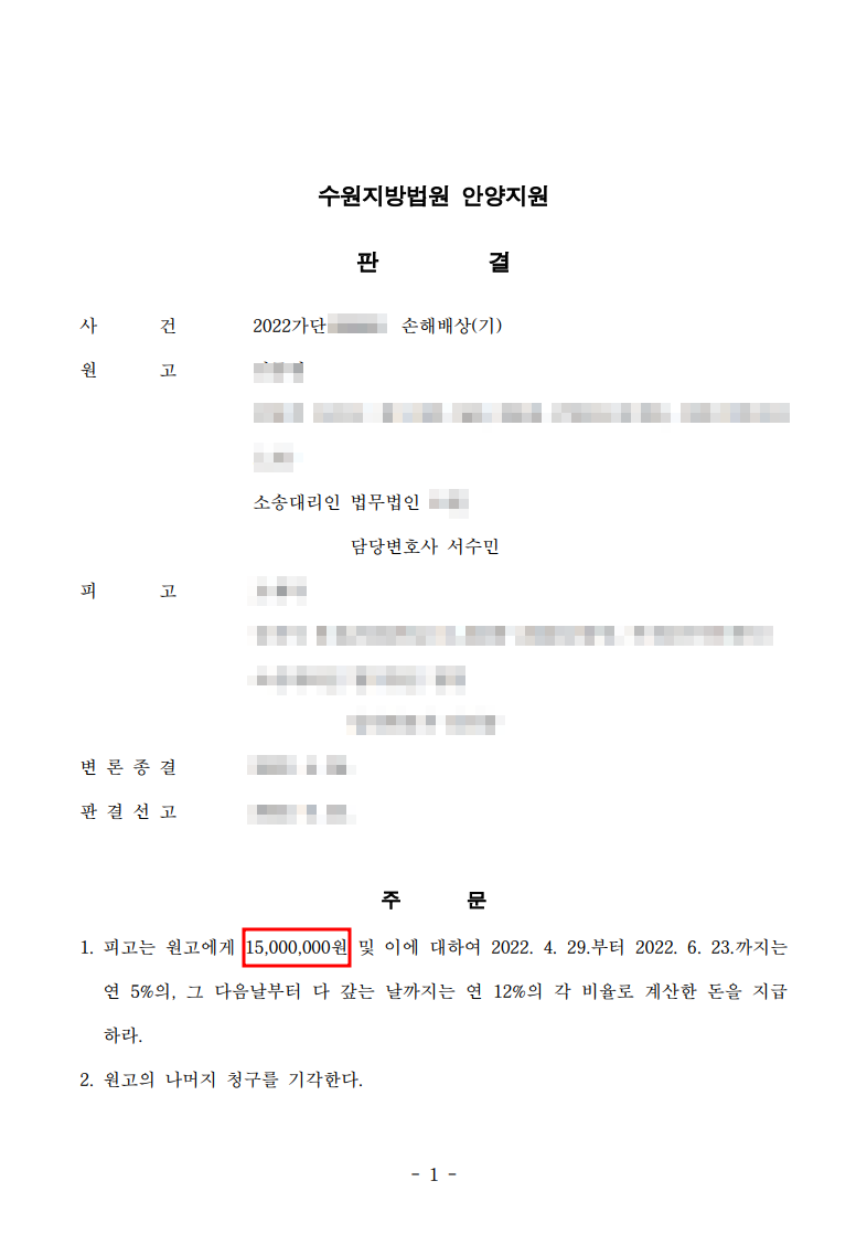 결론적으로 원고는 피고를 상대로 1,500만 원의 손해배상금을 지급받게 되었습니다.