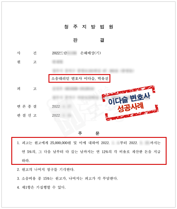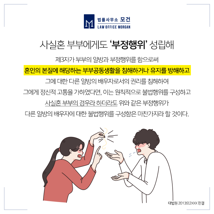 법률사무소 모건은 의뢰인과 소외인 사이의 사실혼관계의 증명, 피고가 소외인에게 사실혼 배우자가 있음을 알면서도 부정행위를 한 사실을 입증하였고, 법원 역시 이를 인정하여 "피고는 원고에게 위자료 2,500만원 및 지연손해금을 지급하라"는 판결을 내려주었습니다.
