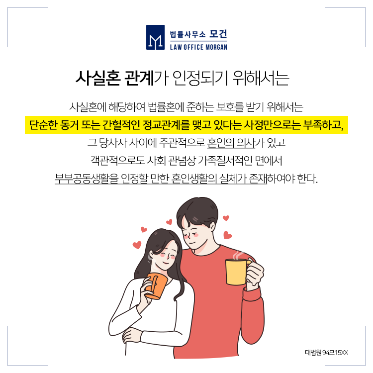 혼인의 의사를 가지고 결혼식을 올리더라도 만약을 대비해 혼인신고는 뒤로 미루는 신혼부부들도 많습니다. 그외에도 여러 사정에 따라 함께 동거하며 대외적으로 부부로 생활하면서도 혼인신고는 하지 않는 분들이 계시는데요.