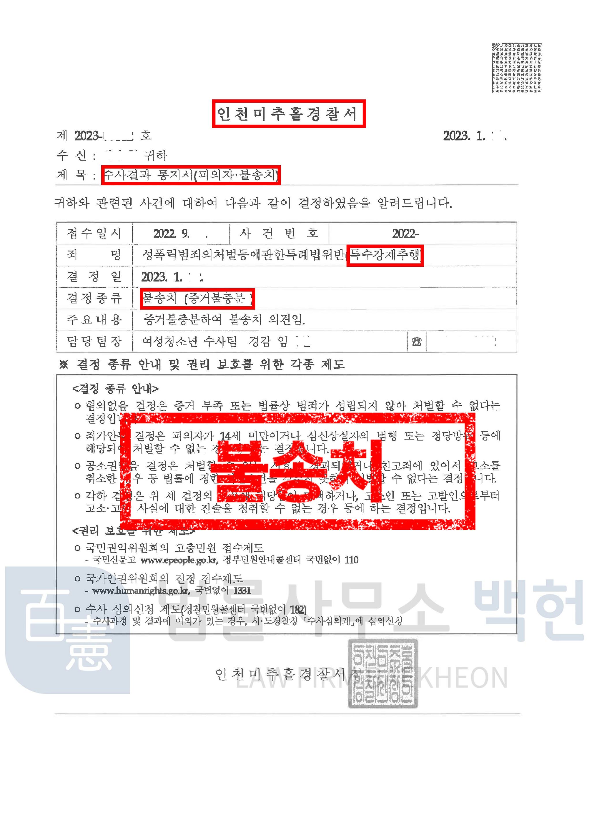 수사기관도 본 변호인의 의견서와 변론 내용을 심사숙고 한 끝에, 변호인의 의견서 내용을 받아 들여 의뢰인들에게 혐의없음 처분을 하였습니다. 의뢰인은 자칫 성범죄 전과자가 될 위기에 있었으나 적절한 시기에 본 변호인의 도움을 받아 억울함을 풀 수 있었습니다.