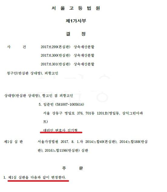 항소심에서 상대방 5의 대리를 맡아서 청구인의 유리했던 1심 부분과