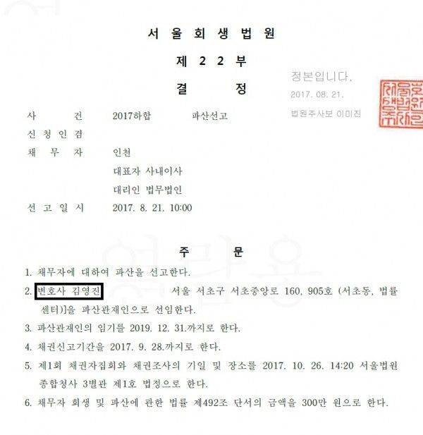 2. 파산선고일 : 2017.08.21. 10:00