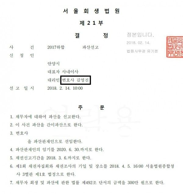 1. 법인파산 신청대리인 : 김영진 변호사