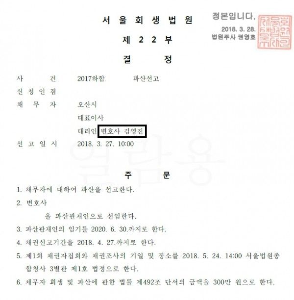 1. 법인파산 신청대리인 : 김영진 변호사