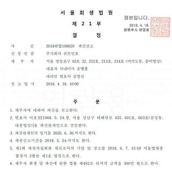 2. 파산선고일 : 2018.04.18. 10:00