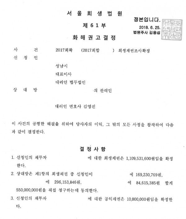 신청인은 물품대금채권 1,124,140,600원을 회생채권으로 신고하였으나, 관리인인 상대방은 공익채권이 포함되어 있고 채무자 회사가 착오변제한 금액이 있으며 신청인이 하도급 거래의 공정화에 관한 법률에 따른 직불청구권을 행사함에 따라 전액을 부인하자, 신청인이 이에 불복하여 회생채권조사확정재판을 신청하였다. 법원은 공익채권 및 채무자 회사가 착오변제한 금액을 회생채권에서 제외하고 직불청구권을 행사한 금액을 차감하는 내용으로 화해권고결정을 하였다.