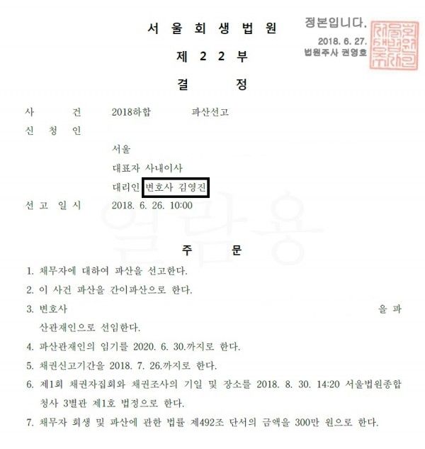 1. 법인파산 신청대리인 : 김영진 변호사