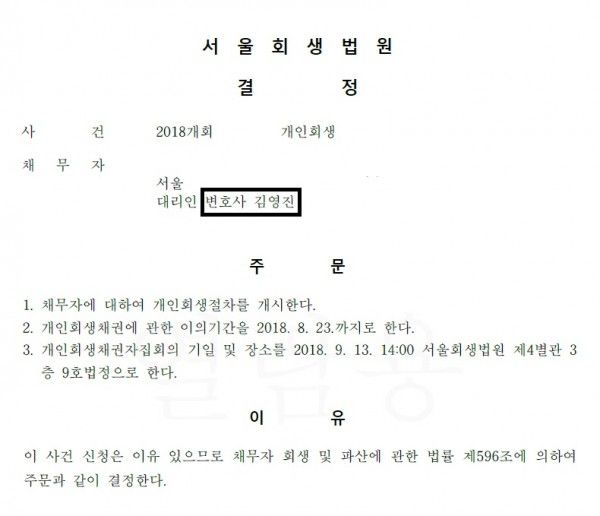 1. 개인회생 신청대리인 : 김영진 변호사
