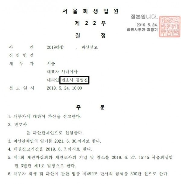 2. 파산선고일 : 2019.05.24. 10:00