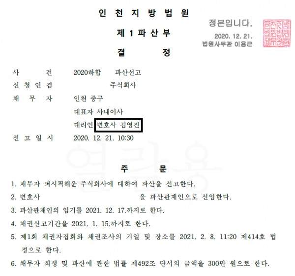 이에 채무자 회사는 지급불능 및 부채초과의 파산원인 사실이 존재하므로, 채무자 회생 및 파산에 관한 법률 제305조, 제306조를 적용하여 파산이 선고되었다.