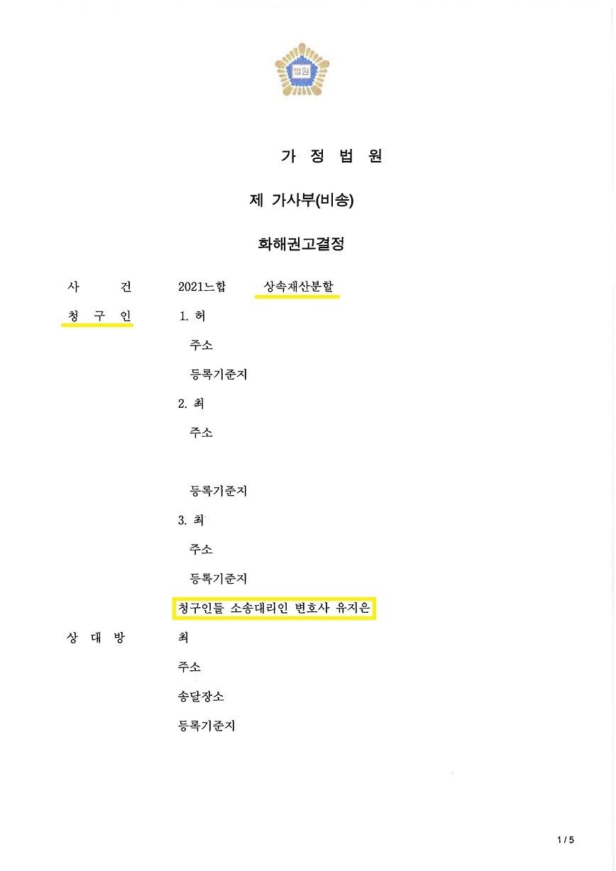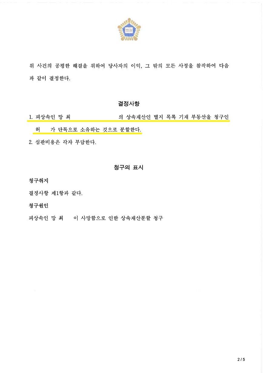 결국, 재판부에서 어머니의 기여분을 100% 인정하여 상속재산인 부동산을 어머니가 단독으로 소유하는 것으로 분할하며 성공적으로 마무리된 사안입니다.