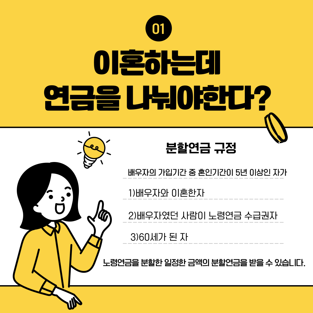 오늘 말씀드릴 사안은 재산분할과 관련한 분쟁 사례입니다. 부부가 혼인 기간 동안 공동으로 형성하고 축적한 재산에 대해서는 기여도를 고려하여 재산분할을 하는데요. 국민연금법은 연금도 재산분할 대상으로 정하고 혼인 기간에 따라서 분할연금을 수급할 수 있도록 하고 있습니다.